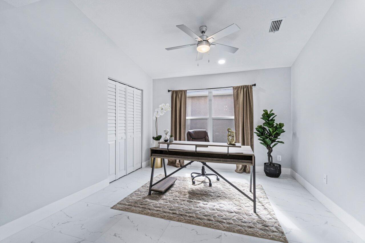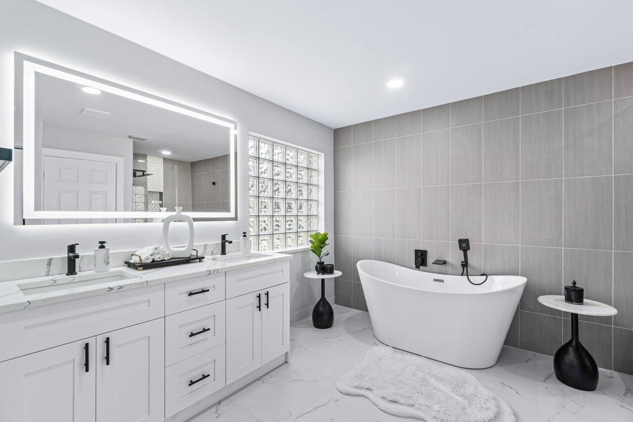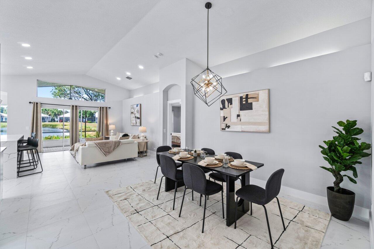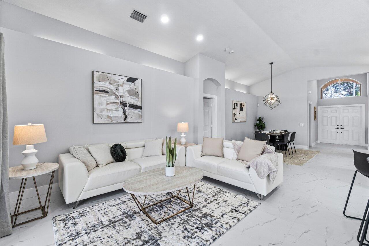 Welcome to your dream home in the picturesque Valencia Lakes! This beautifully renovated 3-bedroom, 2-bathroom residence offers unparalleled lake views, arguably the best in the community. Step inside to an open floor plan adorned with exquisite marble-style porcelain flooring that seamlessly flows throughout all living spaces. Chef's kitchen, featuring brand new Samsung stainless steel appliances, new 2025 AC, kitchen island, ample storage, and sleek recessed & pendant lighting. It's the perfect space for culinary creations and entertaining guests. Retreat to the luxurious primary suite, where relaxation awaits. Indulge in the separate soaking tub or the walk-in shower, complemented by his and hers vanities, offering both convenience and elegance.