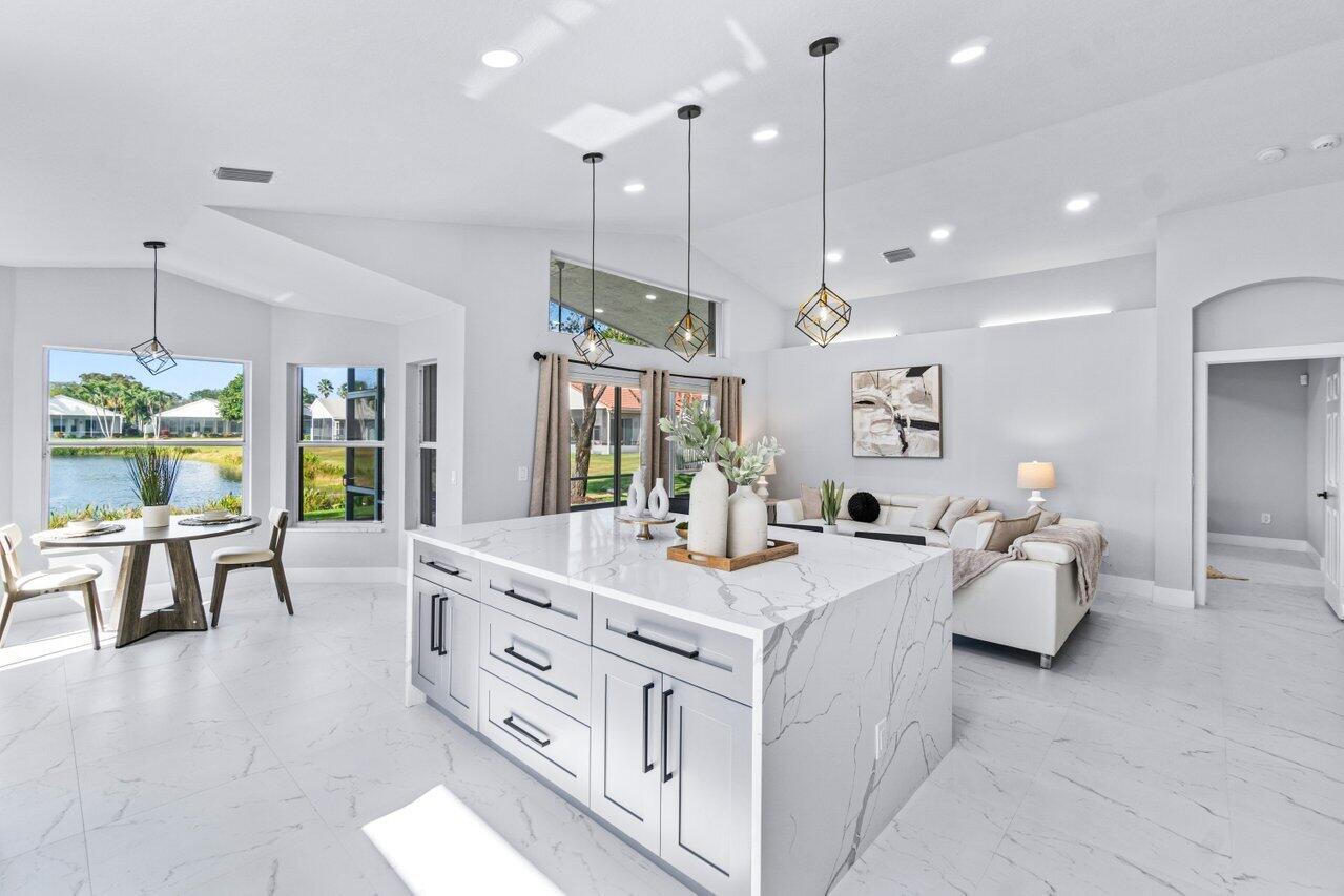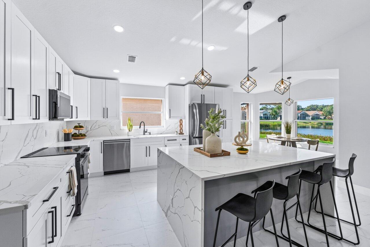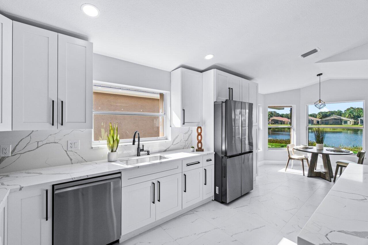Welcome to your dream home in the picturesque Valencia Lakes! This BEAUTIFULLY RENOVATED 3-bedroom, 2-bathroom residence offers unparalleled lake views, arguable the best in the community. NEW 2025 AC. Step inside to an open floor plan adorned with exquisite marble-style porcelain flooring that seamlessly flows throughout all living spaces. Chef's kitchen, featuring brand new Samsung stainless steel appliances, kitchen island, ample storage, and sleek recessed & pendant lighting. It's the perfect space for culinary creations and entertaining guests. Retreat to the luxurious primary suite, where relaxation awaits. Indulge in the separate soaking tub or the walk-in shower, complemented by his and hers vanities, offering both convenience and elegance.