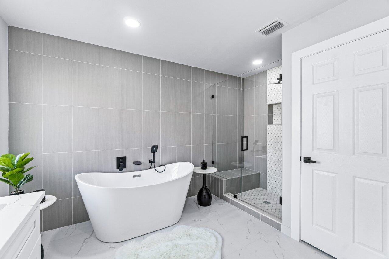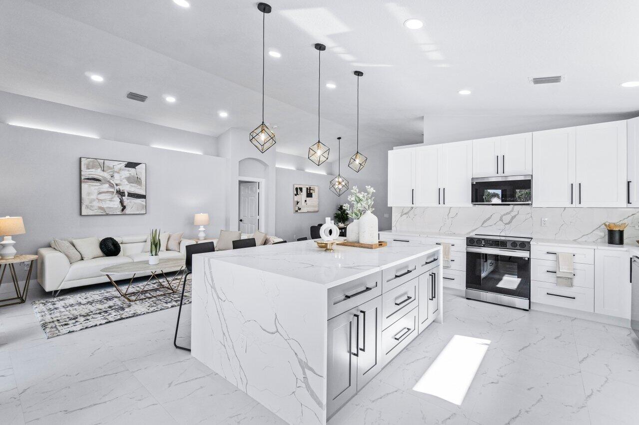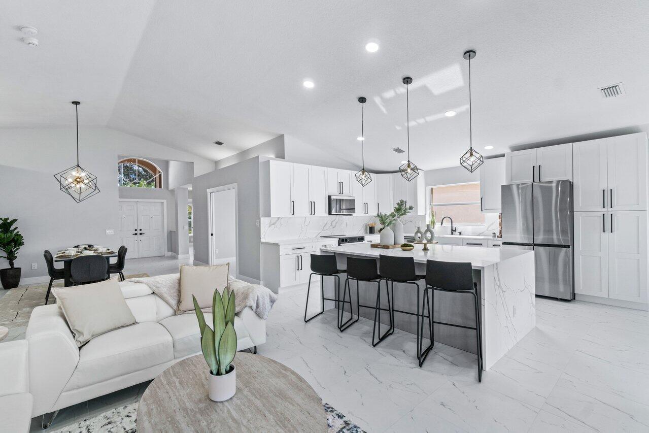 Welcome to your dream home in the picturesque Valencia Lakes! This BEAUTIFULLY RENOVATED 3-bedroom, 2-bathroom residence offers unparalleled lake views, arguable the best in the community. NEW 2025 AC. Step inside to an open floor plan adorned with exquisite marble-style porcelain flooring that seamlessly flows throughout all living spaces. Chef's kitchen, featuring brand new Samsung stainless steel appliances, kitchen island, ample storage, and sleek recessed & pendant lighting. It's the perfect space for culinary creations and entertaining guests. Retreat to the luxurious primary suite, where relaxation awaits. Indulge in the separate soaking tub or the walk-in shower, complemented by his and hers vanities, offering both convenience and elegance.