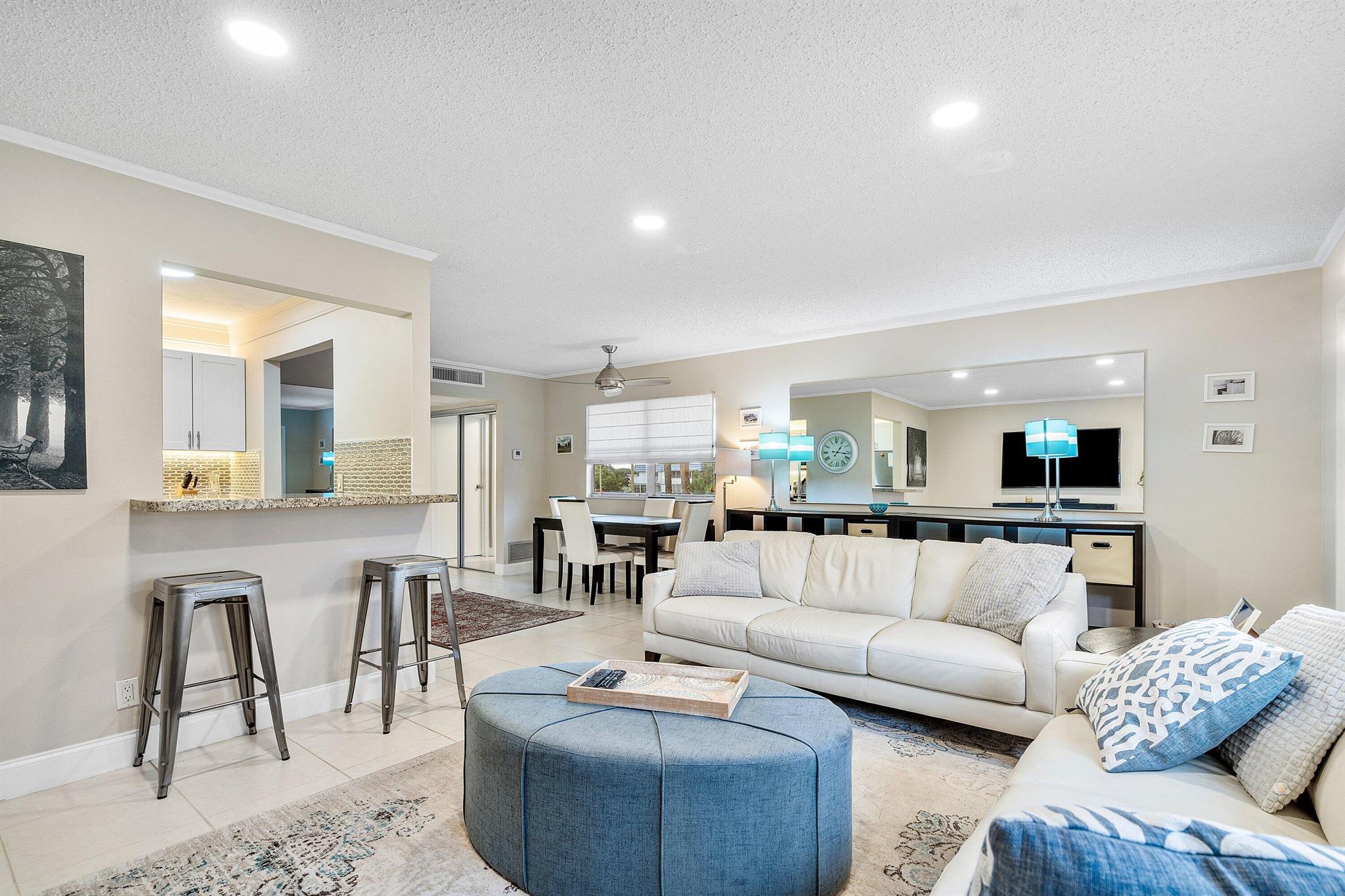 55+ COMMUNITY. Spacious, fully furnished 1 bed, 1.5 bath condo in Kings Point. This beautifully remodeled second-floor corner unit offers great natural light, updated kitchen and baths, and an open, comfortable layout. Move-in ready with stylish furnishings and access to Kings Point's resort-style amenities including golf, pools, fitness centers, and more. Requirements First month, last month and security deposit equal to 3 months rent. Min 650 credit. Income 2.5X
